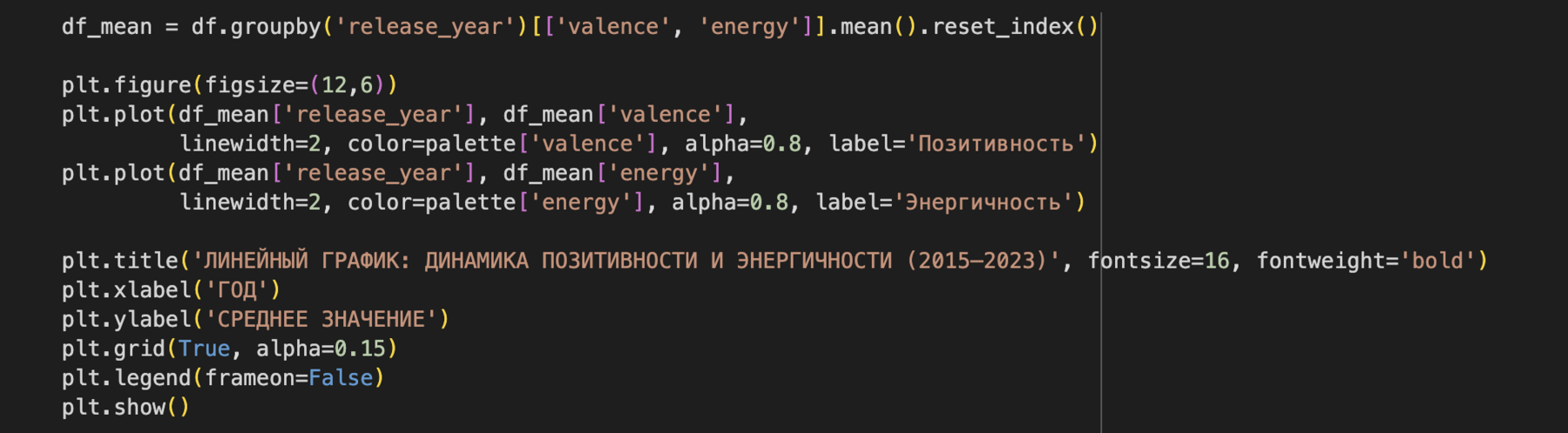 Работа с данными велась с использованием библиотеки Pandas. На первом этапе был загружен CSV-файл с данными, после чего я привела информацию о годе релиза треков к числовому формату. Далее датасет был отфильтрован по диапазону 2015–2023 годов, чтобы сосредоточиться на современной музыкальной сцене.