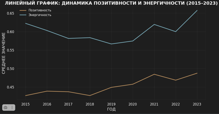 Линейный график демонстрирует динамику средних значений позитивности и энергичности треков по годам. Он позволяет увидеть, насколько стабильны эти характеристики во времени и происходят ли заметные сдвиги в общем настроении популярной музыки.