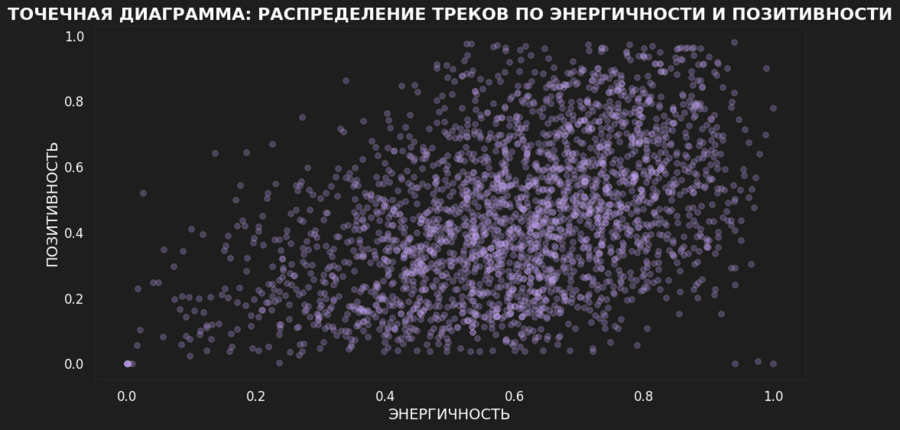 Точечная диаграмма показывает распределение треков в пространстве энергичности и позитивности. Такой формат позволяет оценить плотность точек и увидеть, какие сочетания этих характеристик встречаются чаще всего, а какие остаются редкими.