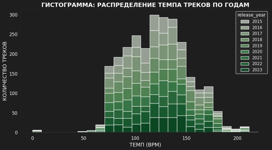 Гистограмма используется для анализа распределения темпа треков. С её помощью можно понять, в каком диапазоне BPM чаще всего находится популярная музыка и насколько разнообразен ритмический рисунок треков.