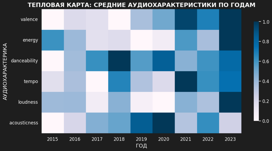 Тепловая карта объединяет сразу несколько аудиохарактеристик и показывает их средние значения по годам. Этот график помогает сравнивать характеристики между собой и отслеживать общие изменения музыкального звучания во времени.
