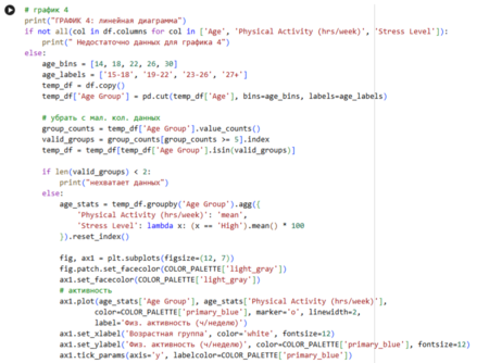 Четвертый и последний график — линейная диаграмма. Она отображает изменения активности и стресса у студентов разных возрастов и зависимость двух представленных метрик друг от друга.