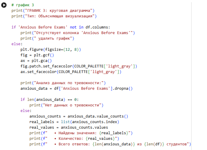 Третий график является круговой диаграммой и отображает распределение тревожности перед экзаменами среди студентов.