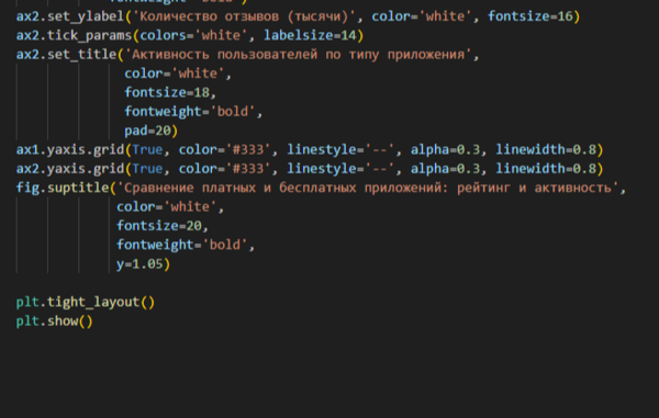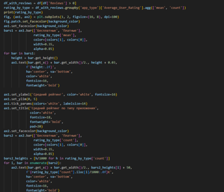 Получилась столбчатая диаграмма с средним рейтингом бесплатных и платных приложением, а также активностью пользователей. 497 000 пользователей App Store выбирают бесплатные приложения.