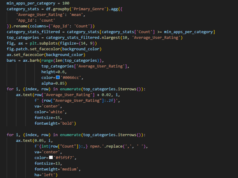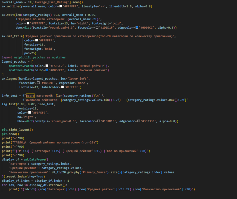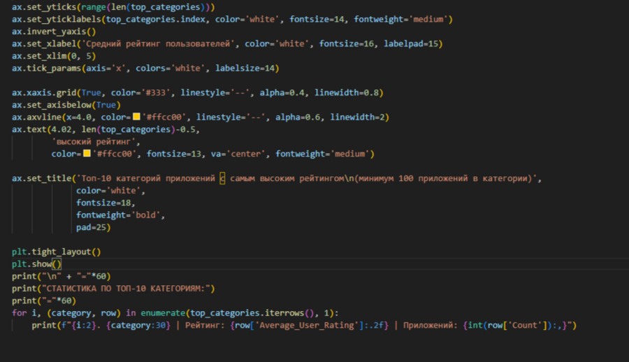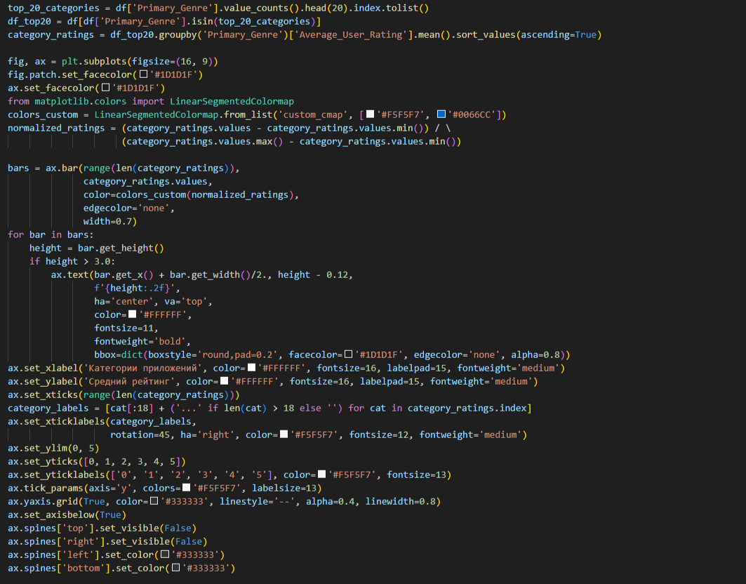 Для визуализации результатов анализа были выбраны несколько типов графиков, наиболее подходящих для представления табличных данных и сравнения категорий: