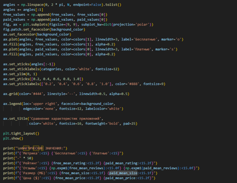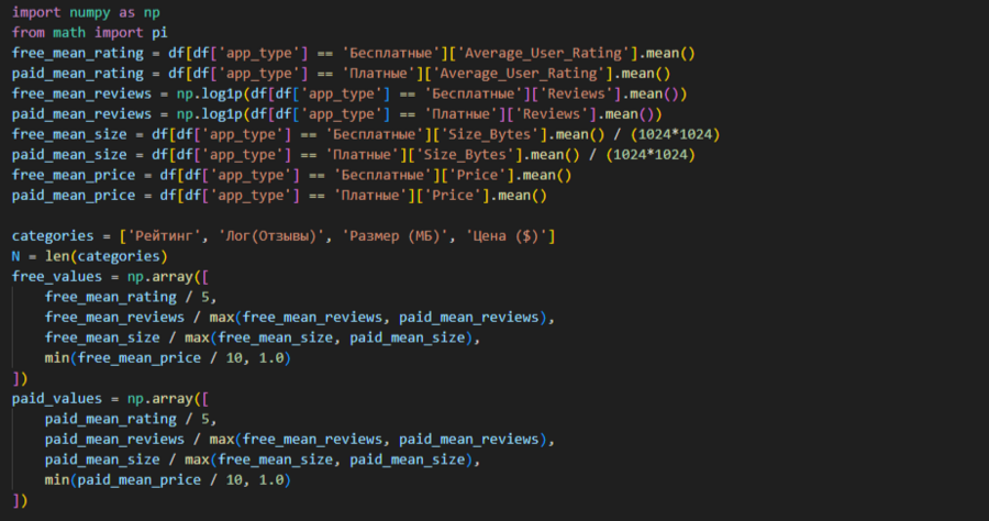 В радар-диаграмме учтены размеры приложений, количество отзывов, рейтинг и цена.