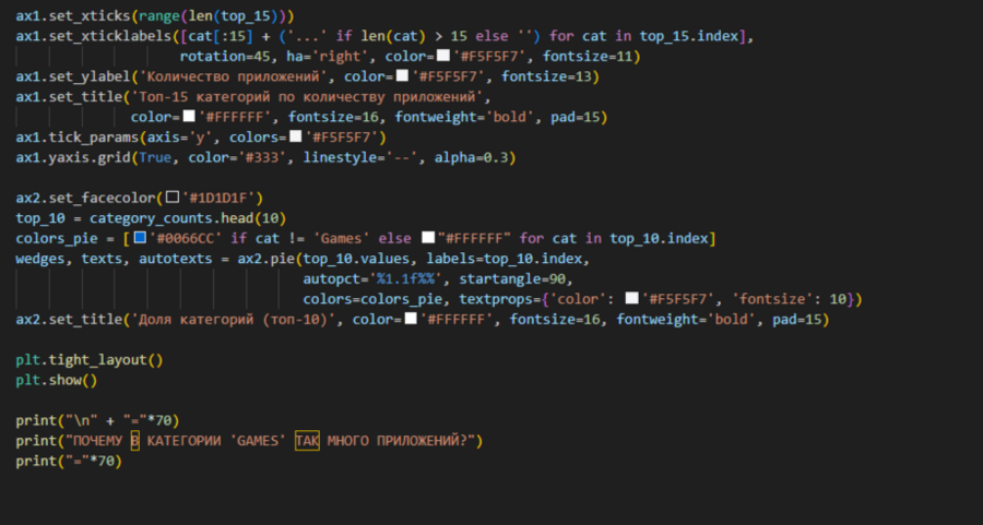 Столбчатая и круговая диаграммы — для определения доли приложений разных категорий в App Store;
