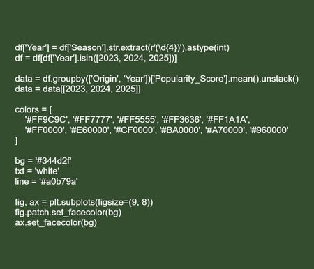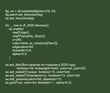 Этот график рассматривает динамику популярности напитков по странам за период с 2023–2025 год. Я высчитываю среднее значение популярности всех напитков за этот год в этом городе. Видно, что популярность напитков во многих странах была довольно высокой в 2023 году и почему-то снизилась к 2025 году.