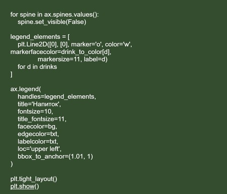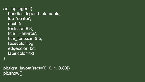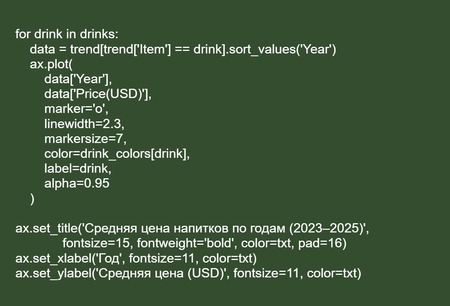 В этом графике я рассматриваю динамику роста средней цены каждого напитка за период с 2023 по 2025 год. По графику можно понять, что самый большой перепад цен у большинства напитков произошел в 2024 году. Позже некоторые пошли в спад, а что-то наоборот возросло в цене.