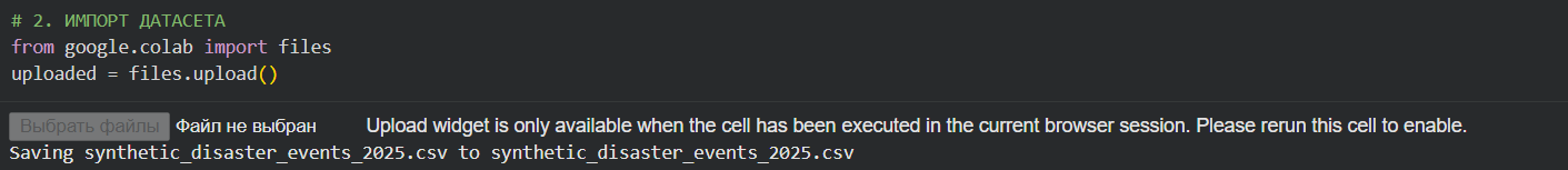 Был скачан датасет «synthetic_disaster_events_2025.csv» с сайта Kaggle в формате csv.