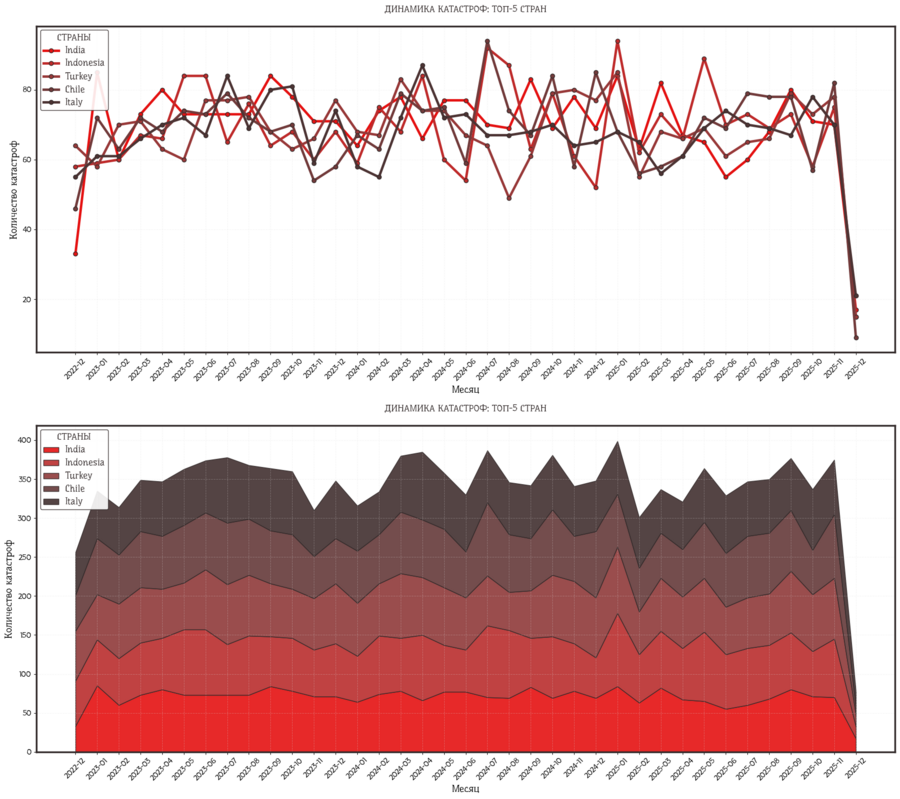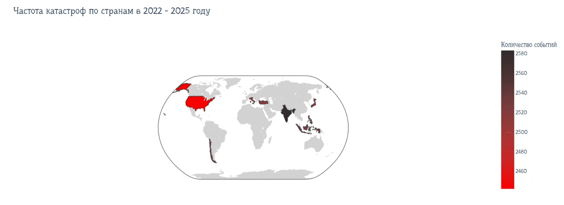 Самое маленькое количество бедствий во всех странах происходило в начале 2025 года, в то время как самое большое количество — летом 2024.