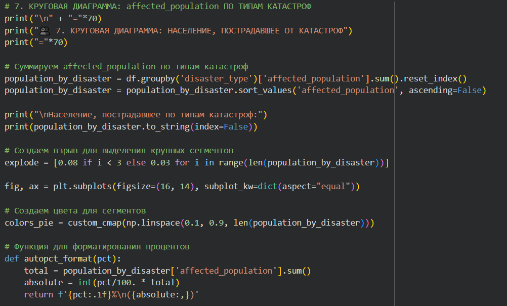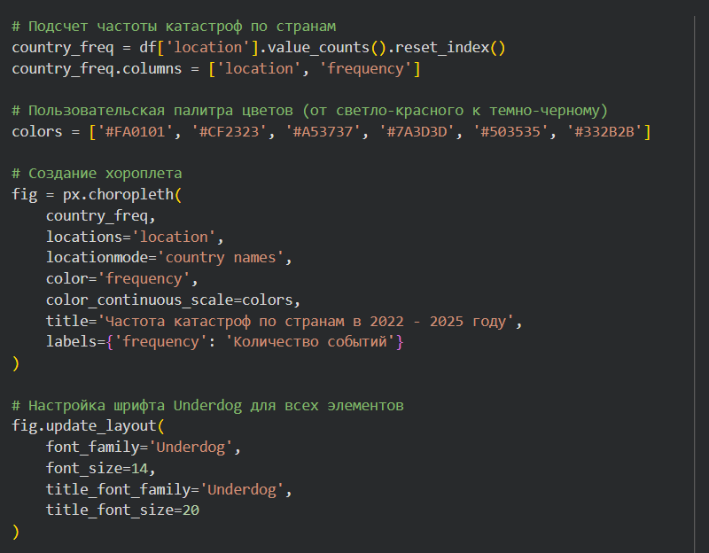 В данном проекте будут анализироваться подробности крупных природных катастроф 2022 — 2025 и графики помогут в определении самых многочисленных и опасных из них. Графики, что будут использоваться: • Хороплет (чтобы показать страны с большим количеством катастроф) • Столбчатая диаграмма (для определения самых многочисленных катастроф) • Линейные графики (для отслеживания динамики в топ-5 странах) • Тепловая карта (для определения самых «опасных» месяцев) • Круговая диаграмма (для определения количества пострадавшего населения)