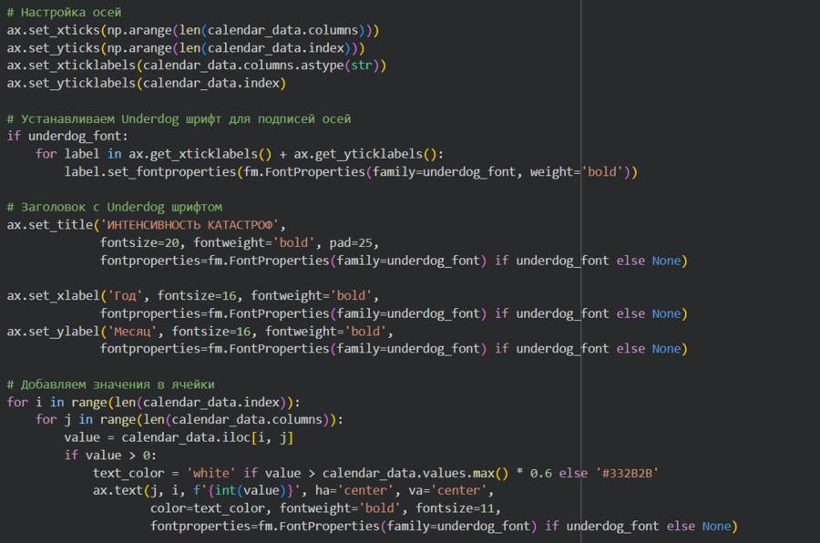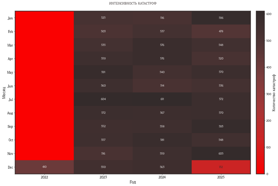 Данная тепловая карта дополняет предыдущую, подтверждая, что самое большое количество катастроф происходило летом, а меньше всего — зимой.