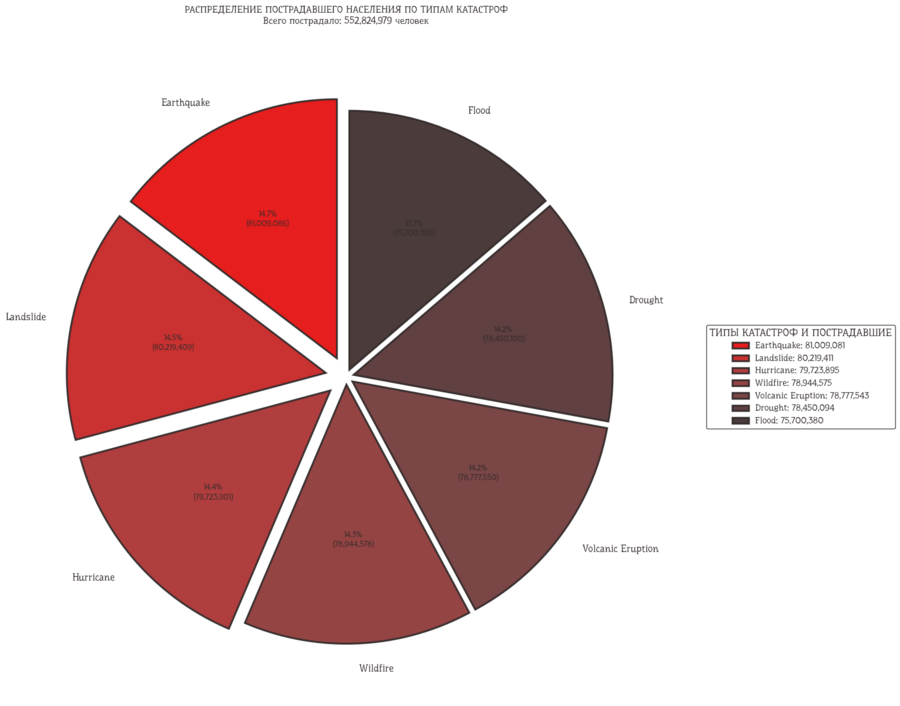 Анализируя данную диаграмму можно выявить процент людей пострадавших в разных типах катастроф.
