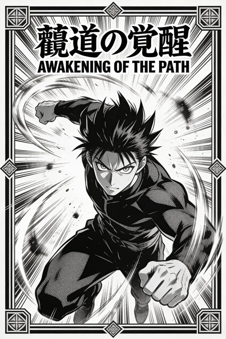 Обложка для проекта была сгенерирована так же в Perplexity AI. Использовался следующий промпт: «Create a manga-style book cover in a tall vertical format (1140×1600 pixels). The composition should feature a dynamic action scene with a powerful protagonist in the center, drawn in classic manga black-and-white ink style with bold linework and dramatic halftone shading. Include sharp, expressive eyes and an intense facial expression. The background should have motion lines and speed effects radiating outward to create a sense of movement and energy. Add Japanese-inspired design elements: geometric patterns, decorative corner details, and bold typography with a title in both Japanese characters and English. Use high contrast between black and white areas with minimal grey tones for a traditional manga aesthetic. The overall composition should be dramatic and eye-catching, suitable for a manga volume cover.»
