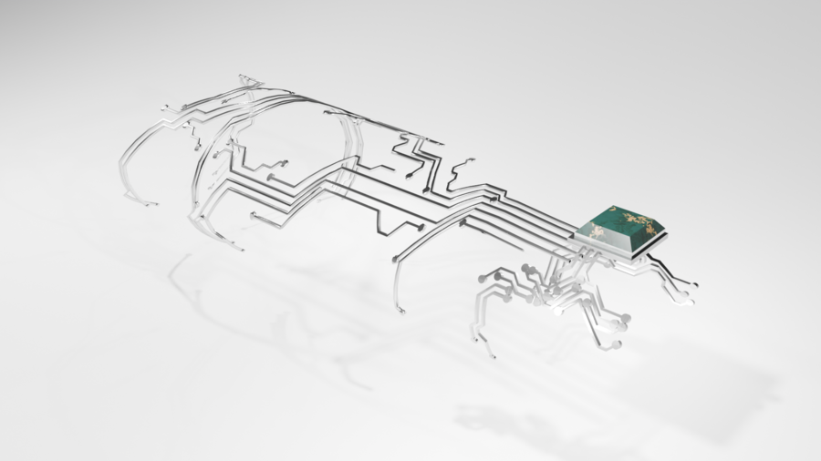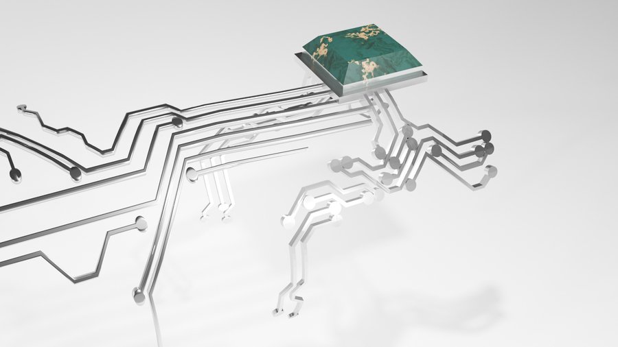 Шрифт представляет из себя печатную плату: подложка как основная пластина и наполнение из трасс, проводящих ток. Основа кольца формируется за счет формы Х, далее к ней присоединяются части других глифов