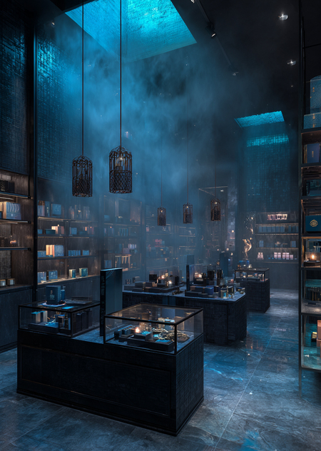 /imagine prompt: A dark, atmospheric cosmetics store interior, deep blue and gray tones, atmospheric fog, a mystical and mysterious atmosphere, spectacular lighting with soft shadows, luxurious packaging design, exquisite, high detail, ultra-realistic in a dark Chinese style. Генерация была создана с помощью MidJourney.