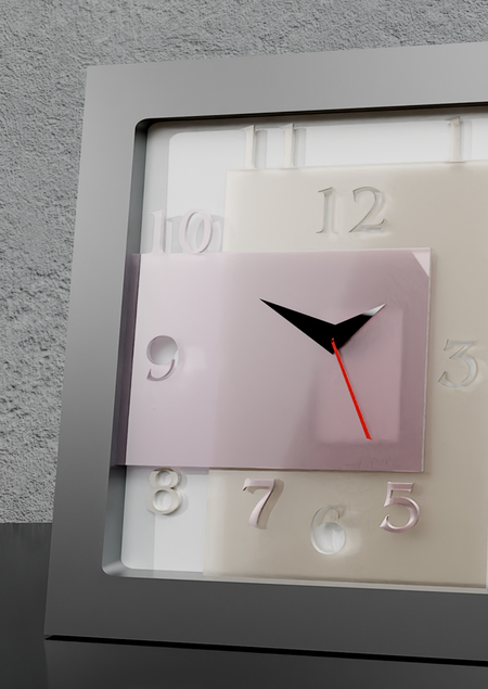 Будильник-календарь в стиле 80-х и ретро-футуризма c угловатым корпусом и грубыми кнопками. Циферблат из слоев стекла наложенных друг на друга, создающие ощущение объема. Массивное основание из серого текстурированного пластика. Цифры и дата написаны выбранным шрифтом.