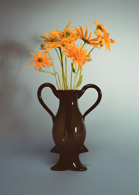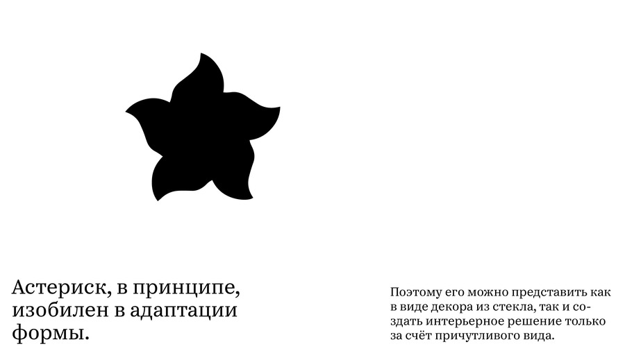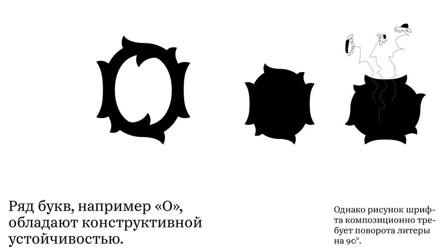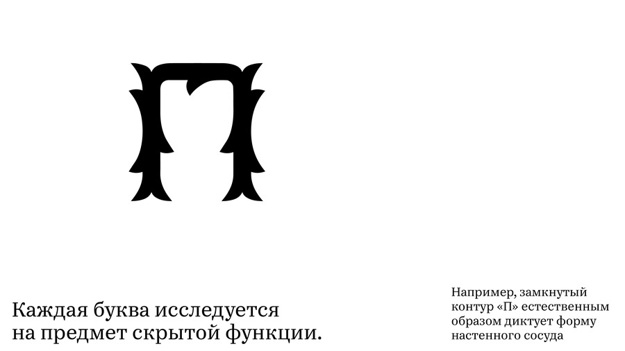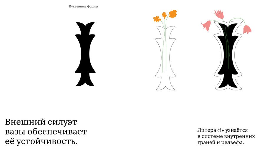 Форма трансформируется от структурного гротеска к декоративным растительным формам. Буквенные формы интерпретированы как вазы, визуализируя свойство шрифта
