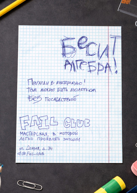 Плакаты, стилизованные под страницы школьной тетради: с полями, каракулями, подписями, переписками между двумя «персонажами».