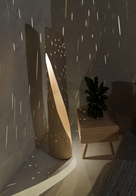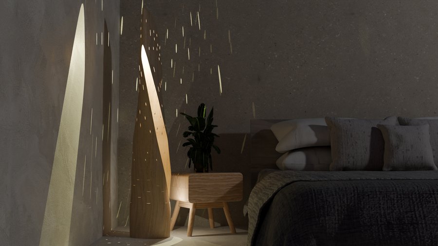 Через тонкие прорези его скульптурной формы тёплое сияние рассеивается по стенам и потолку, создавая плавные абстрактные узоры, словно свет сам начинает дышать и двигаться. Минимализм формы сочетается с волшебной атмосферой, делая интерьер одновременно уютным и гармоничным.