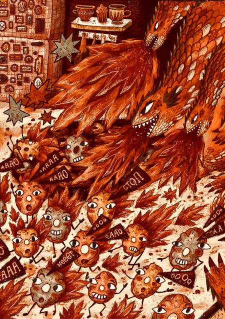 Змей Горыныч готовит пончики. Чтобы сделать это быстрее, он решает своим пламенем поджарить пончики, но слегка перебарщивает, из-за чего они оживают и убегают.