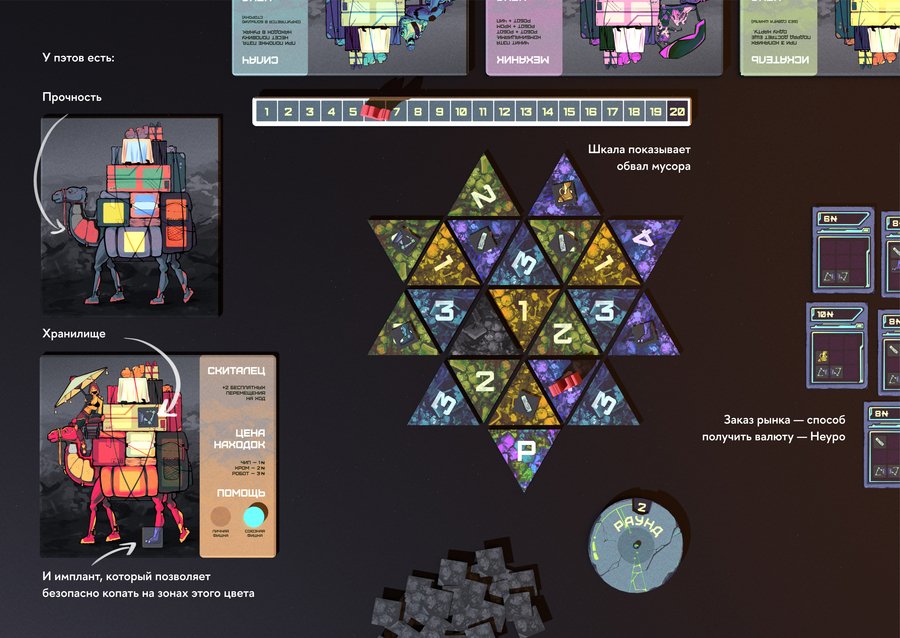 То, что нашли на свалке кладём в свой или общий Пэт. ресурса из колоды.
