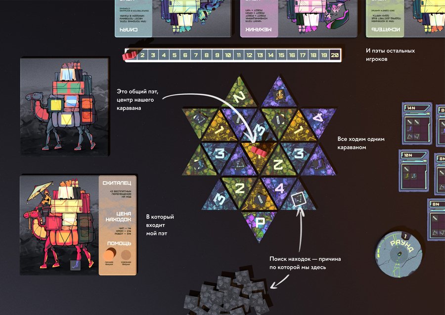 В начале хода перемещаешь караван на соседний тайл бесплатно У тебя есть 4 типа действий и их модификаторы.