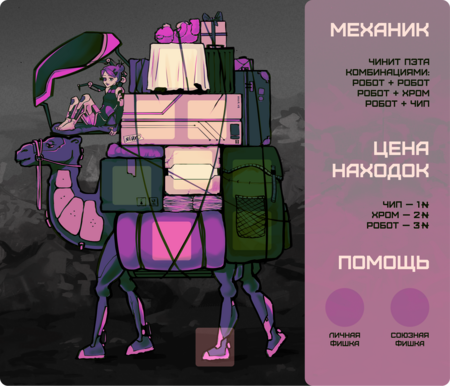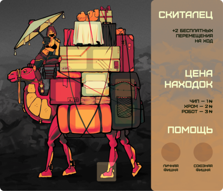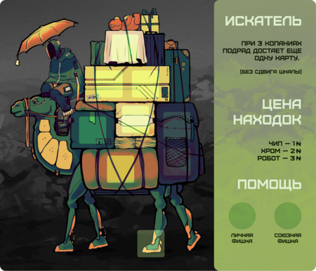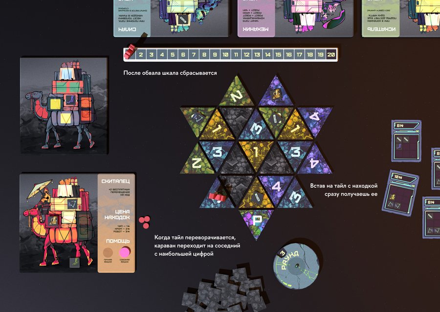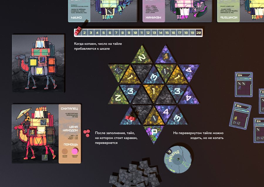 На тайлах лежат находки, поощеряющие скрапперов бродить по полю. На перевернутых тайлах раз в раунд появляется находка.