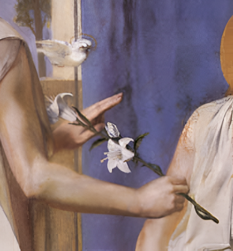 Белые облачения изображённых на картине Д. Г. Россетти «Благовещение» Богородицы и Архангела Гавриила служат символами божественной святости Архангела и непорочной чистоты Девы Марии. Та же семантика раскрывается в произведении художника «Юность Девы Марии» в белых одеяниях юной Мадонны и её матери, Святой Анны. Белый голубь и белые лилии ассоциируются со Святым Духом, божественной чистотой, целомудрием и небесной красотой.