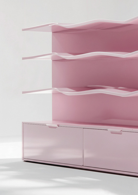 Стойка для продавца с лицевой стороны повторяет главную изогнутую линию в айдентике бренда, а с тыльной — служит шкафчиком для хранения изделий и необходимого инвентаря для упаковки.