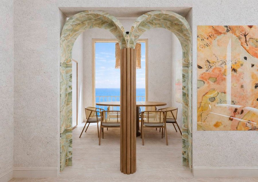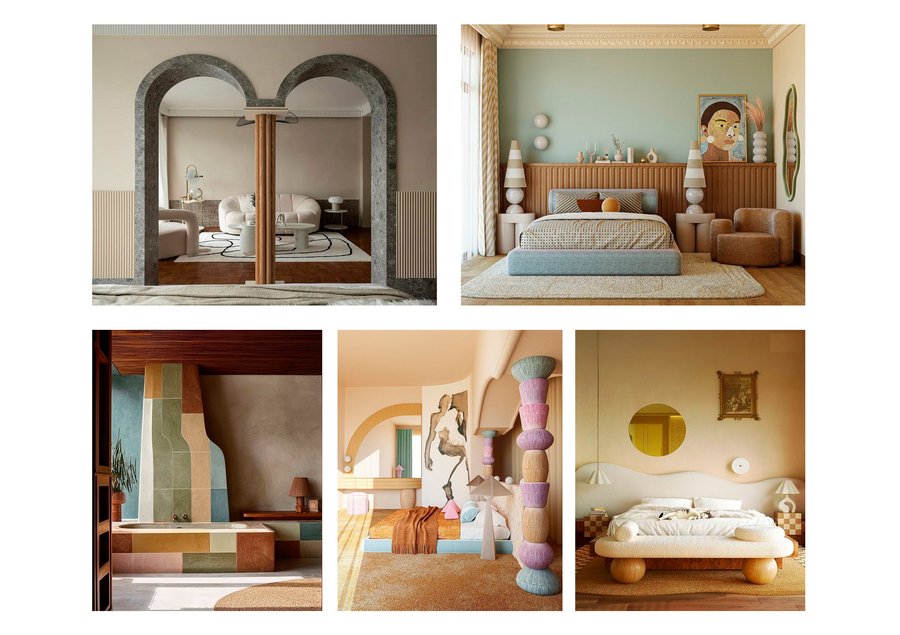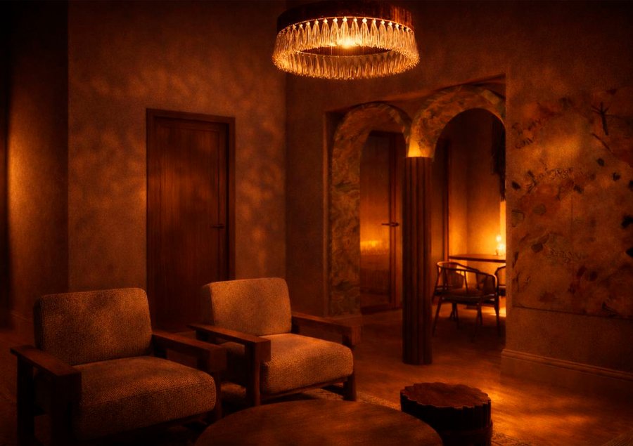 Идея: Показать Каспий через его глубину и архитектурность: арочные силуэты, скульптурные формы, плавные переходы между зонами, спокойные фактуры камня и дерева.