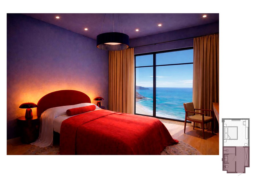 Легенда / идея: Образ Каспия: тихая глубина, светлый берег и мягкая сила природы, переосмысленные в современном минимализме. Волнообразные линии, тактильные фактуры и спокойная пластика форм. Визуальный язык: Камень и тёплое дерево, ореховые оттенки, шерсть, бархат, латунные акценты — баланс гладкого и фактурного. Палитра: База: песочный, ванильный. Акценты: лазурный, терракот, графит, охра/шафран, гранат. Пространственная логика: Лобби — первый контакт, бар — отражение воды, коридоры — движение к морю, номера — разные настроения Каспия. Итог: Современный каспийский минимализм: природность, тишина, глубина и тонкое ремесленное вдохновение в едином выразительном языке.
