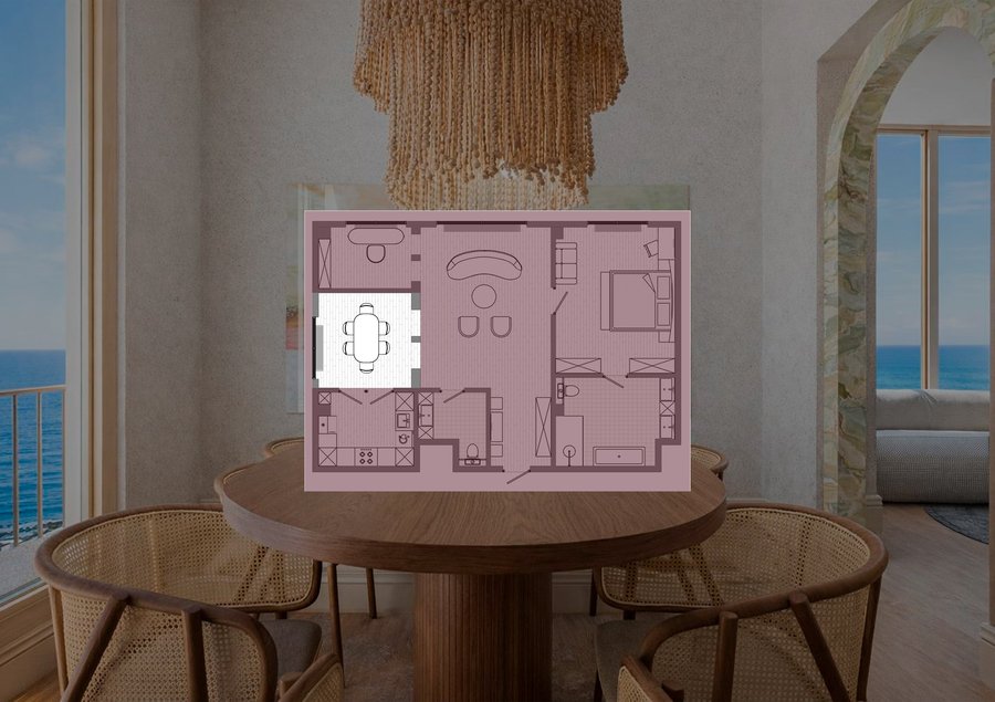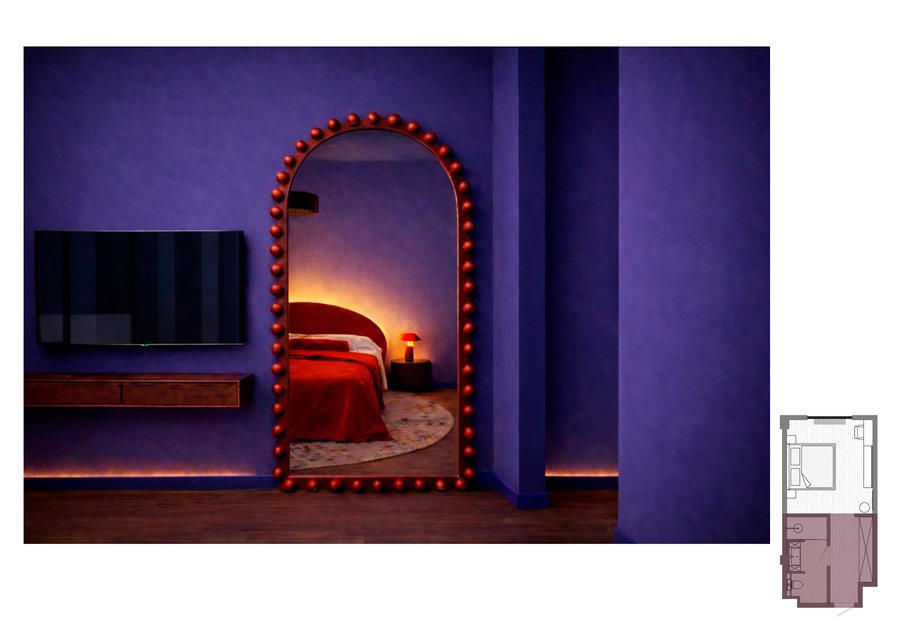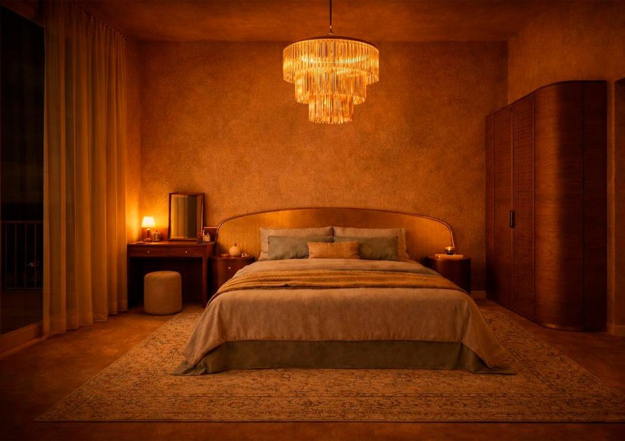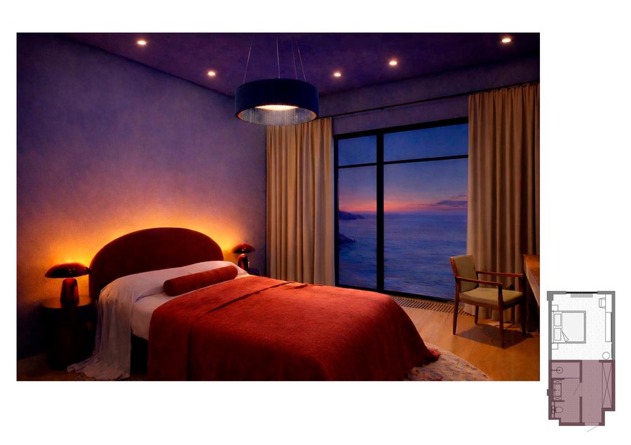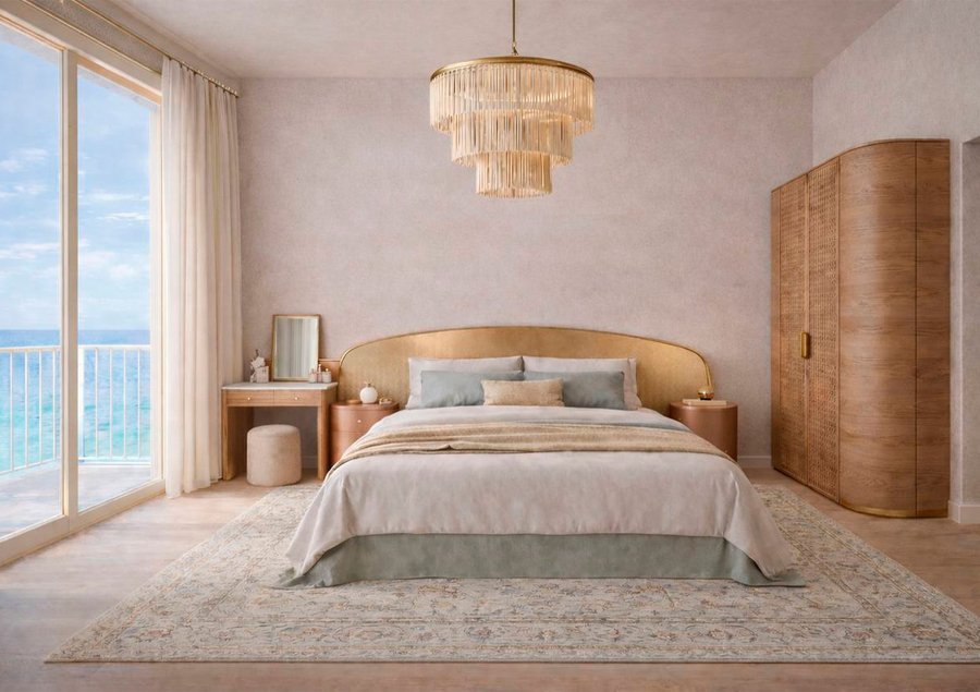 Идея: Передать характер региона через современные интерпретации ремесленных мотивов: тактильные ткани, тёплое дерево, керамические акценты и мягкие волнообразные линии, вдохновлённые побережьем Каспия. Номер не перегружен деталями — в нём важна честность материалов и естественная гармония.