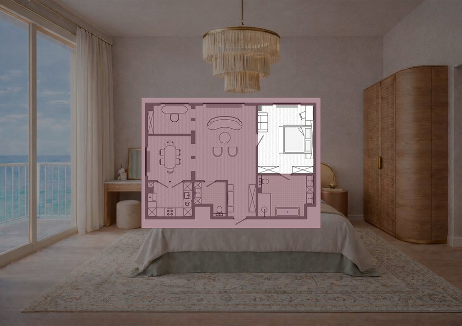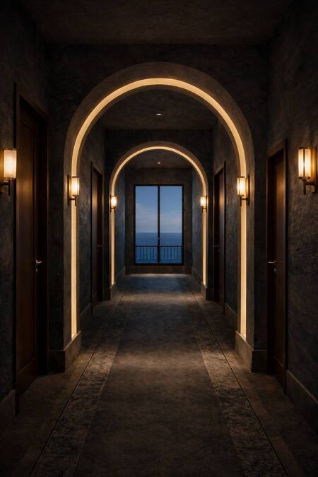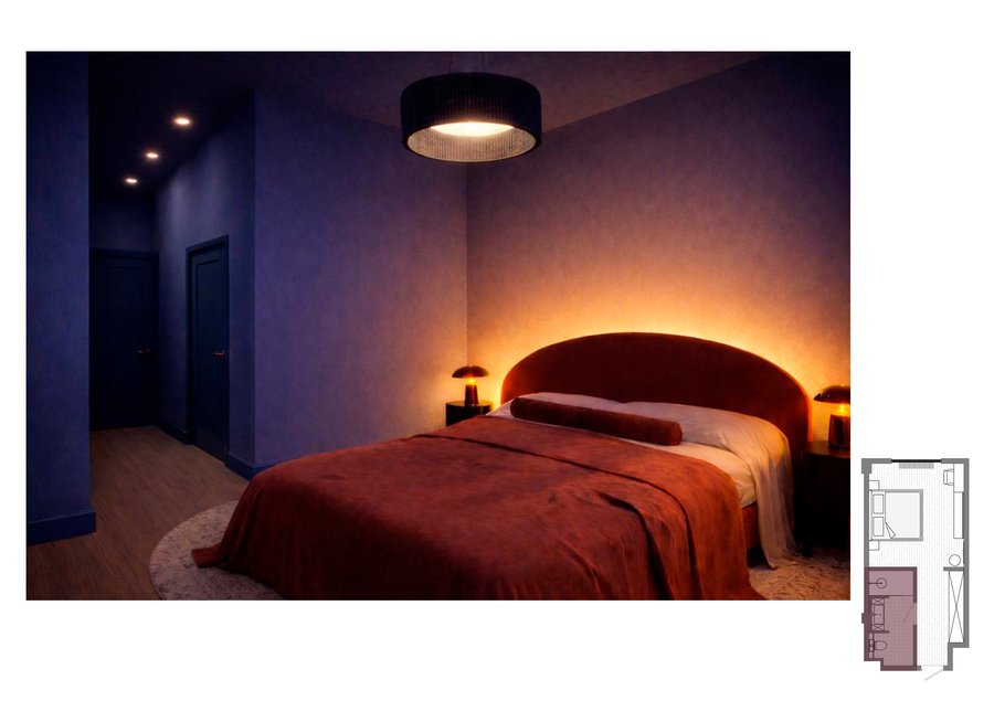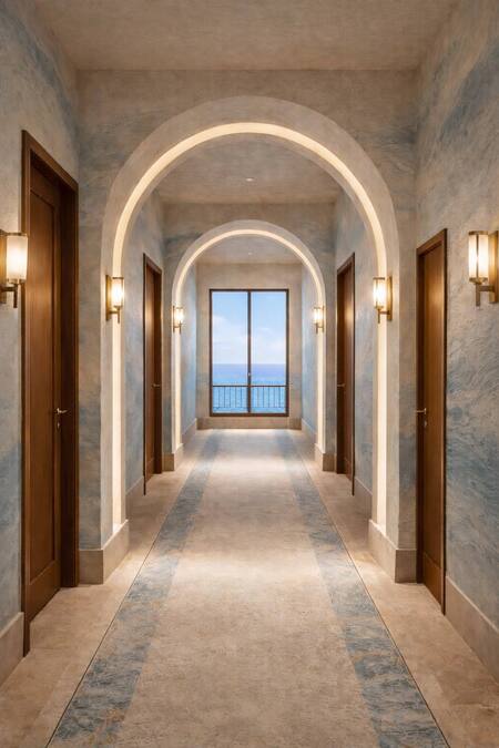 Чем этот номер лучше и чем отличается от остальных: Этот номер отличается не только уровнем комфорта, но и масштабностью решений. Здесь всё работает на эффект присутствия в большом, цельном пространстве: высота, арочные переходы, крупные акценты, выразительное освещение и спокойная, но мощная палитра. Он создан как главный «рассказ» проекта — глубокий и по-настоящему каспийский.