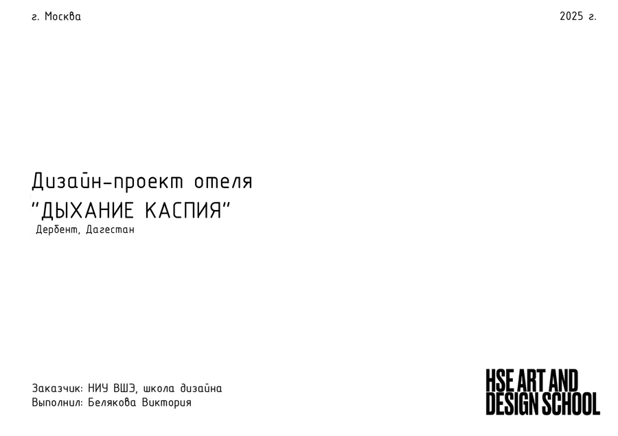 Проект курортного отеля «Дыхание Каспия» расположен на первой линии Каспийского моря в Дагестане, локация входит в федеральную программу «Пять морей и озеро Байкал». Концепция основана на образе Каспия — его тишине, глубине и природном ритме, переосмысленных через современный минимализм и локальные материалы.