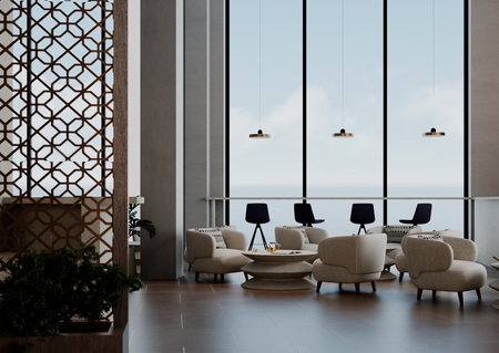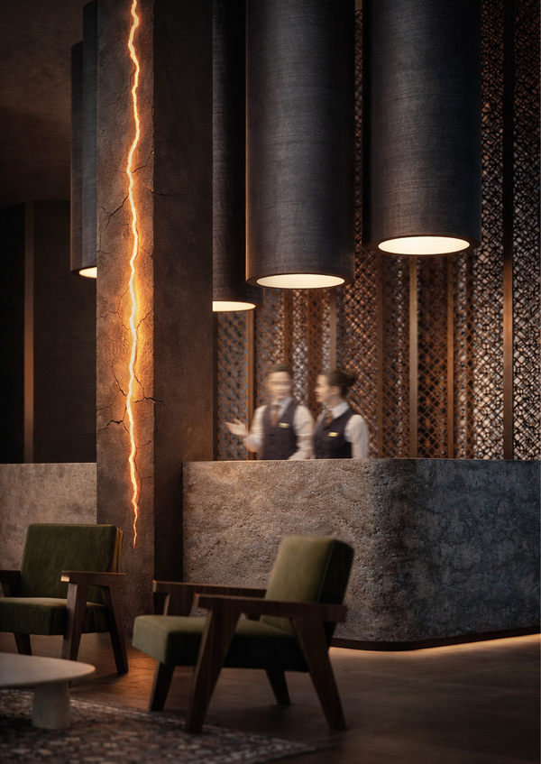 Важной частью лобби становится стойка ресепшен, которая состоит из природных материалов. А в ее центре можно заметить «потрескавшуюся» колонну, что отсылает к грязевым озерам и тематике санатория.
