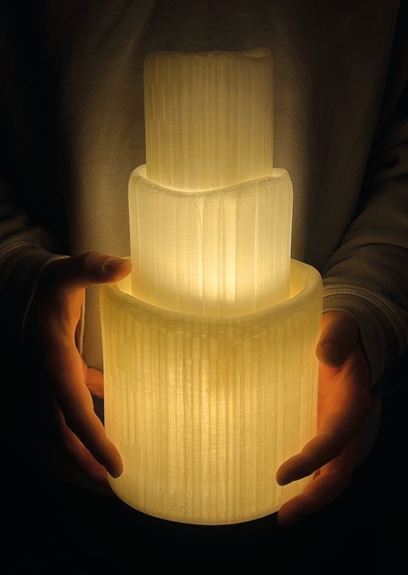 Этот светильник — трансформер, который меняет форму как слои дюн в пустыне. В основе лежит пустой цилиндр с двумя вложенными внутрь ярусами, каждый из которых поднимается по нажатию благодаря скрытым push-механизмам. В собранном состоянии он выглядит как минималистичная монолитная колонна. Одно нажатие — и появляется второй уровень, создавая мягкий рассеянный свет. Ещё одно — поднимается третий, раскрывая всю высоту и превращая светильник в полноценный универсальный источник света.