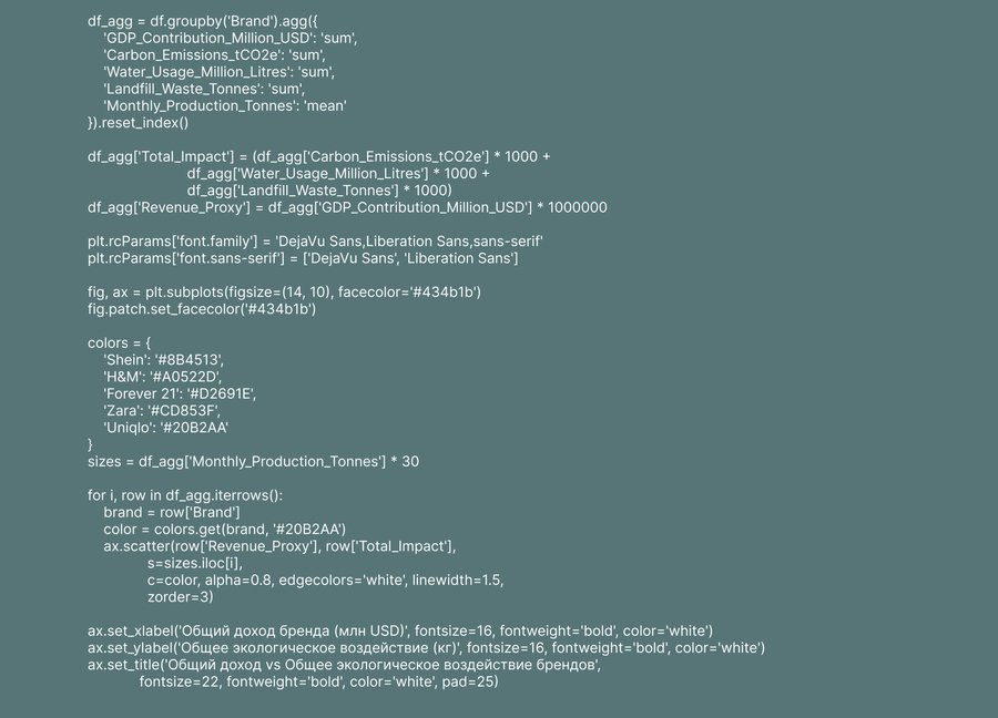 Проведённый анализ на основе четырёх типов диаграмм комплексно раскрывает структуру экологических рисков в индустрии моды, формируя целостную картину проблемы при помощи импользования различных видов графиков и сравнений. Столбчатая диаграмма подтверждает, что экологический след закладывается на самом раннем этапе — выборе материала. Пузырьковая диаграмма раскрывает экономические взаимосвязи: выявлена положительная корреляция между объёмом производства и абсолютными выбросами, в то время как высокая цена не гарантирует низкого воздействия. Круговая диаграммы показывают, что выбросы концентрируются у ограниченного круга глобальных игроков (H& M, Zara, Shein, Uniqlo), несущих системную ответственность. А картограмма имеет чёткую географическую иерархию. Наибольший экологический и социальный риск переносятся в регионы массового производства — Южную и Юго-Восточную Азию, в то время как страны-потребители (Западная Европа, Северная Америка) демонстрируют низкий профиль риска.