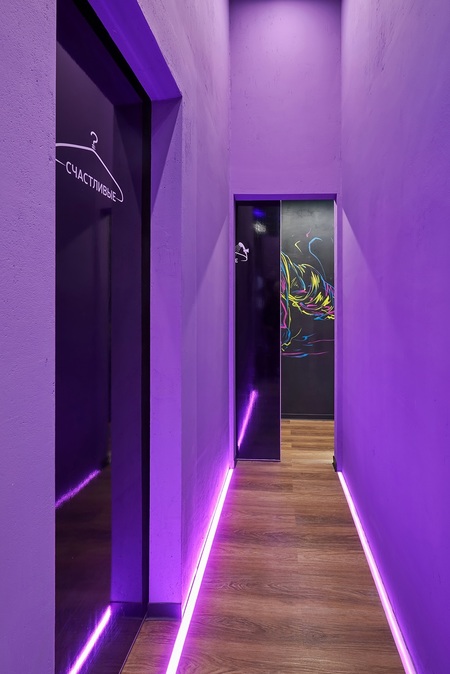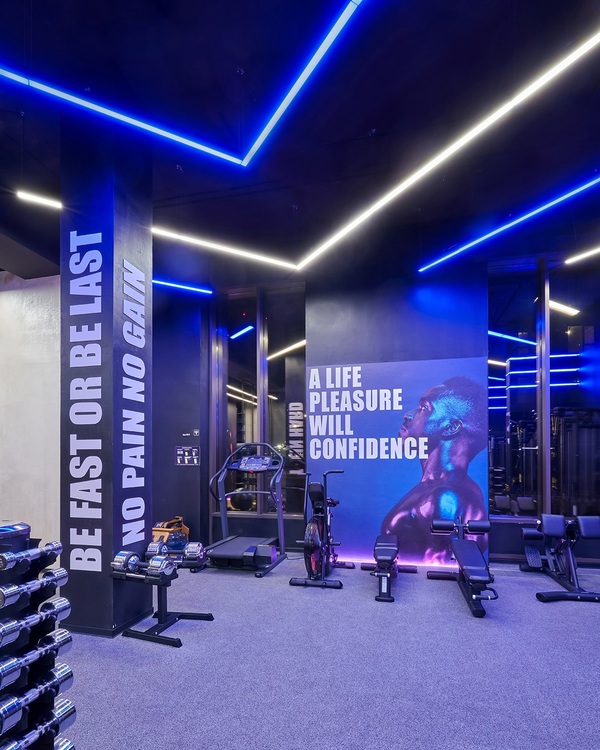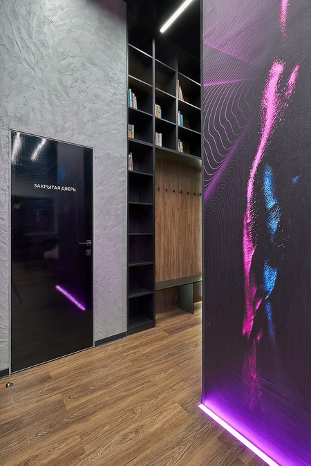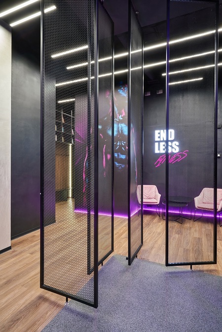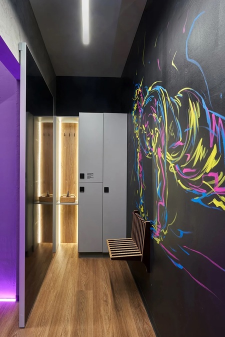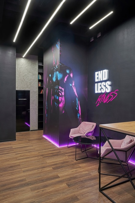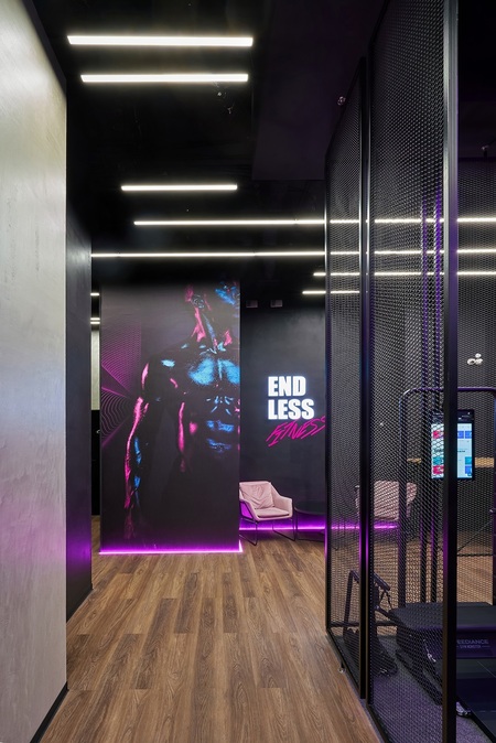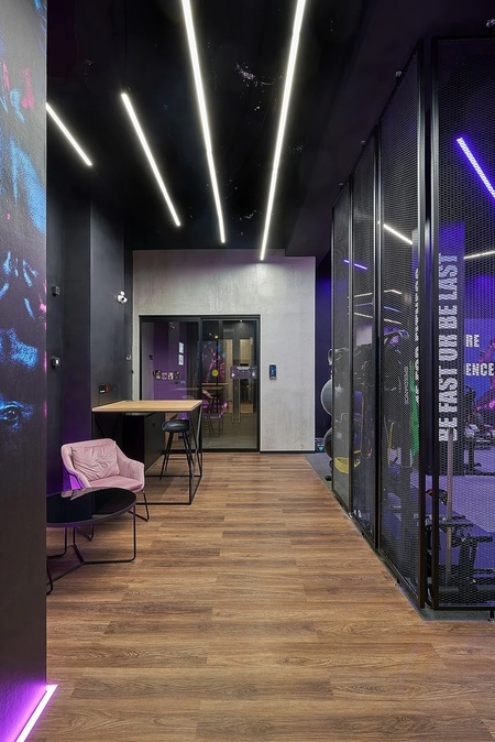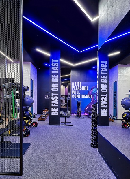Планировка включает тренажёрный зал, раздевалки и зону chill-out для онлайн-форматов. Брендовая айдентика с глубокими сине-фиолетовыми оттенками, графикой и динамичным светом формирует футуристическую атмосферу. Материалы сочетают глянцевые и матовые поверхности, зеркала и износостойкие покрытия.