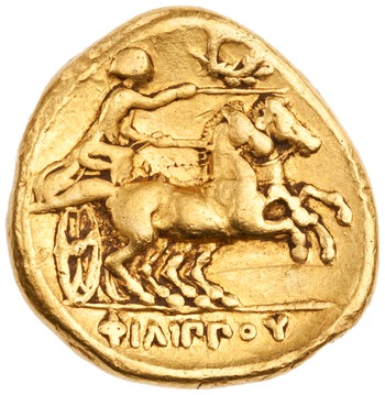 Изображение колесницы символизирует победу Филиппа II на Олимпийских играх (он выигрывал скачки на колесницах несколько раз), что являлось важным элементом демонстрации «греческой» идентичности и статуса.