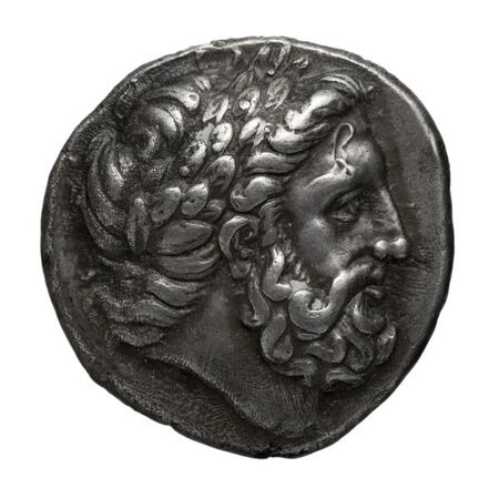 Аверс: изображена голова Зевса, главного олимпийского бога, в лавровом венке, повернутая в право.