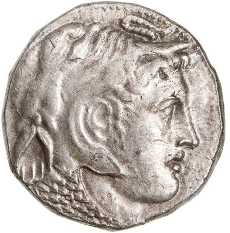 Аверс: голова обожествленного Александра Македонского, в слоновьей шкуре с рогом Зевса Аммона, на шее эгида (плащ или щит из козьей шкуры, возможно с головой Горгоны)