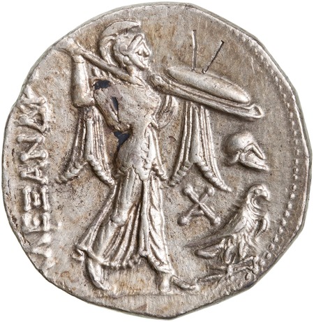Еще один прижизненный тип монет, не заменяющий основной (Геракл/Зевс), но показывающий гибкость пропаганды, монеты с Афиной на аверсе и Никой на реверсе.
