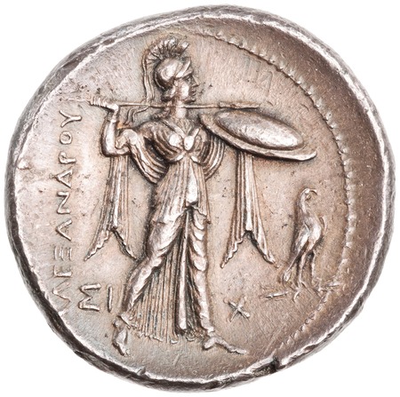 Коринфский шлем символизирует военную мощь и готовность к битве, а изображение змея отсылает к мифологической природе Афины. Венок в правой руке Ники — классический символ победы и славы в Древней Греции, а флагшток в левой руке отсылает к победе греков в морской битве при Саламине в 480 г. до н. э. Использование этого образа подчеркивало, что Александр продолжает дело общегреческой мести персам, легитимизируя свой поход как панэллинское предприятие, хотя сам Александр не одерживал крупных морских побед.