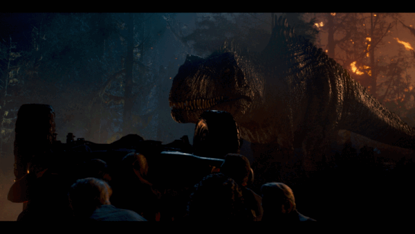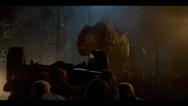 В отличие от 1993 года, где практический макет служил эталоном, в 2022 году практическая голова была построена таким образом, чтобы ее механические шарниры и диапазон движения идеально соответствовали цифровой модели, созданной ILM. Это позволяло команде VFX бесшовно «пришивать» цифровое тело к физической голове прямо в кадре. Этот метод позволил сохранить эмоциональную напряженность сцены (актеры взаимодействуют с реальным объектом), при этом давая ILM полный контроль над движением огромного тела динозавра.