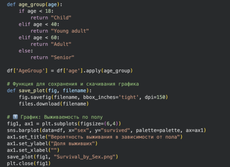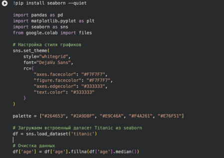 ля анализа данных и визуализации я выбрала датасет пассажиров «Титаника». Эта тема показалась мне интересной. События катастрофы «Титаника» хорошо известны, и анализ данных позволяет взглянуть на них под научным углом. Можно изучить, какие факторы реально влияли на выживание пассажиров, а не только опираться на рассказы и фильмы.