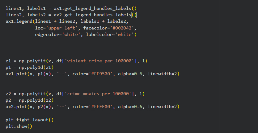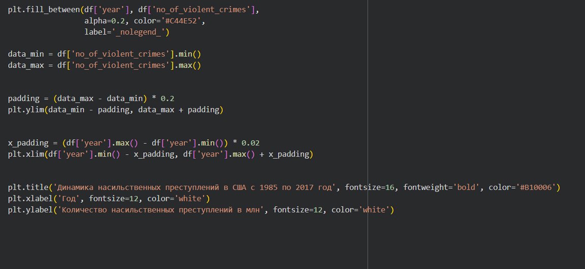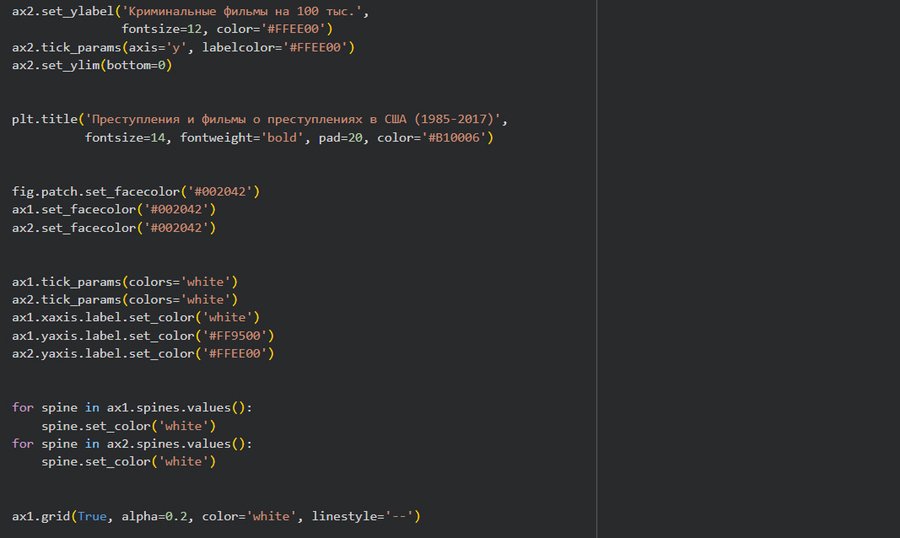 Для графиков были выбраны цвета, ассоциирующиеся с фильмом «Pulp fiction» Тарантино, а желтый и оранжевый также напоминают цвет полицейской ленты, которой оцепляют место преступления. Синий был выбран в качестве фона.