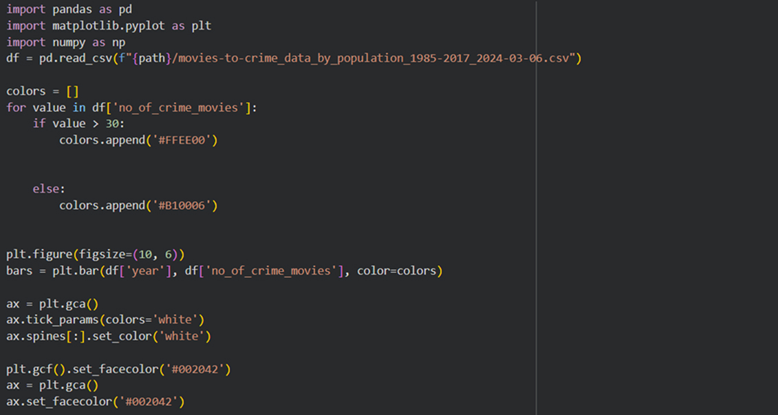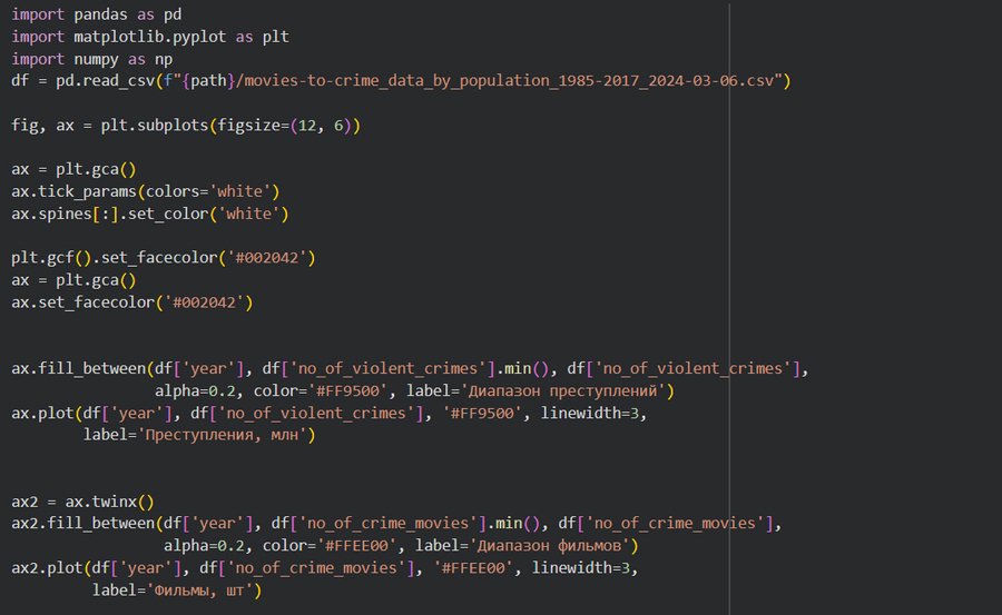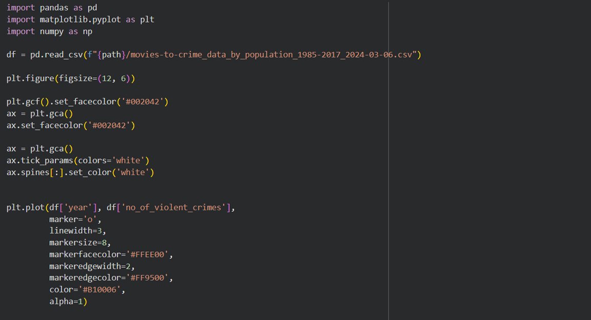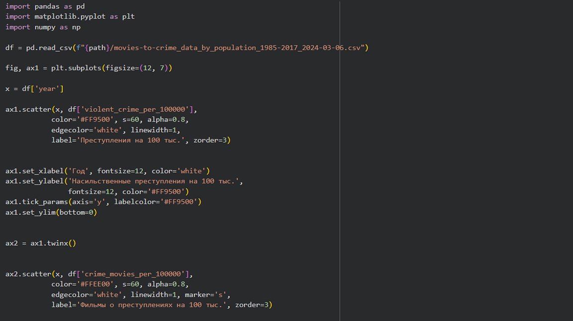 В качестве исследуемого материала был выбран дата сет «Crime Movies VS Violent Crimes in the USA», чтобы исследовать зависимость фильмов о криминале и насильственных преступлений. Существует мнение, что подобное в кино побуждает людей на совершение неправомерных действий. Цель исследования — подтвердить или опровергнуть эту точка зрения.