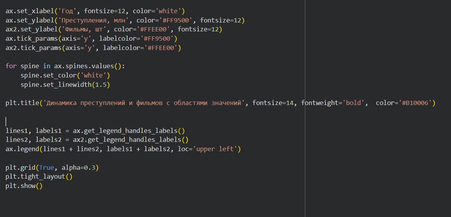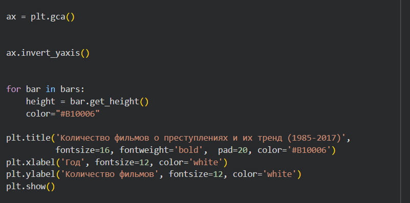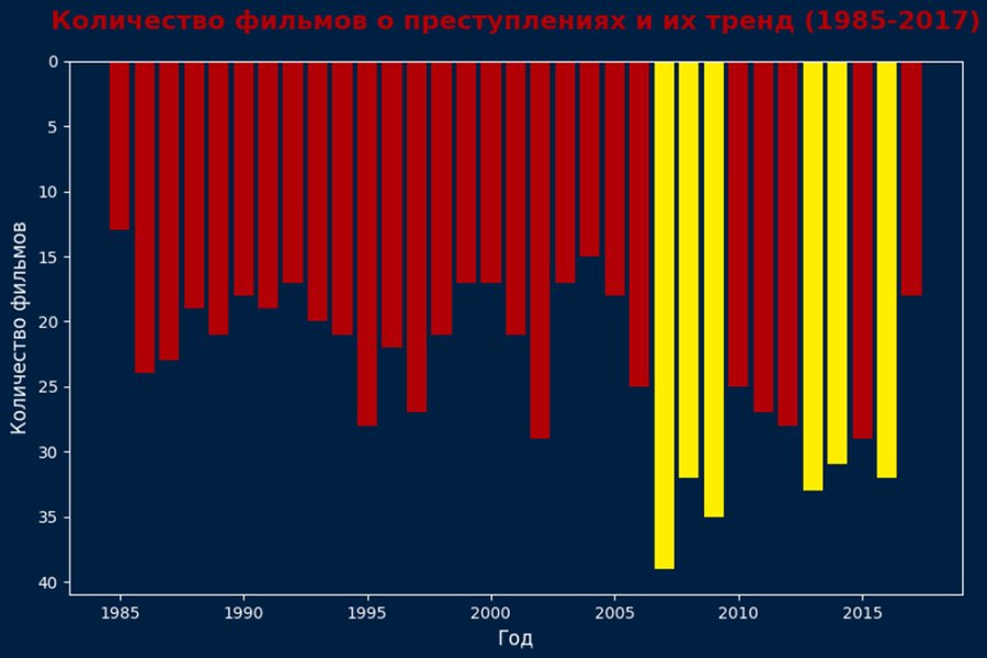 График был намеренно инвертирован относительно оси X, чтобы сымитировать кровь, которая часто фигурирует в фильмах про криминал. Из столбчатой диаграммы следует, что пиковыми точками, когда выпуск криминальных фильмов достигал максимума являются периоды с 2007 по 2010 и с 2013 по 2016 с колебаниями. Очевидно интерес к кино о насилии растет. Пики графика не совпадают с графиком количества преступлений выше, что ставит под сомнения их связь между собой.